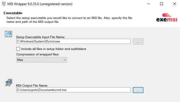 从 https://www.exemsi.com/documentation/getting-started/ 下载免费版本应用程序,执行它并将“恶意”二进制文件包装在其中。